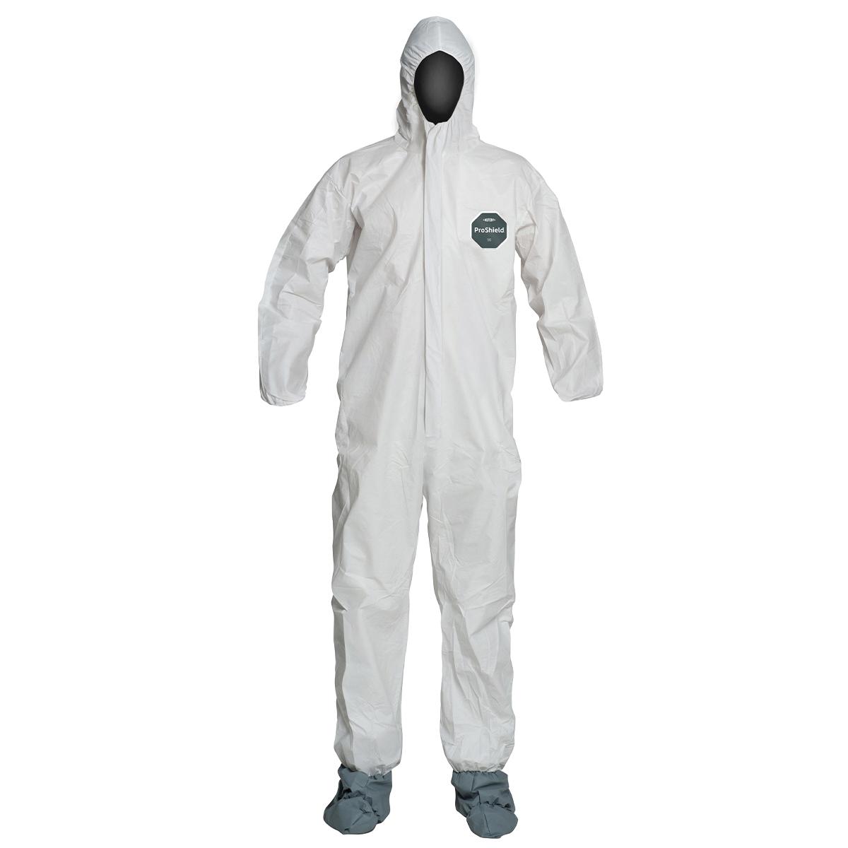 DUPONT™ ProShield® 50 Disposable Coveralls With Hood and Attached Skid-Resistant Boots, 3XL Size, Microporous Film Laminate, White, Fits to Chest Size: 47-3/4 to 51-1/4 in, 28-3/4 in Inseam Length, Dry Particles, Light Liquid Splash, Non-Hazardous Aerosols Hazard, Elastic Ankle, Elastic Cuff, Serged Seam, Zipper Closure, 1.5 oz/sq-yd Fabric Weight, Resists: Abrasion, Flex-Cracking, Puncture, Tear