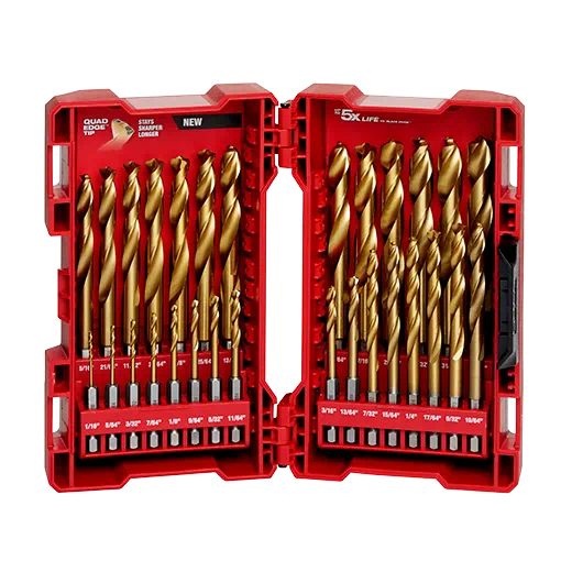 Our SHOCKWAVE™ RED HELIX™ Titanium Drill Bits are engineered for extreme durability and long life. The QUAD EDGE™ tip delivers a precision start and four cutting edges to create smaller chips for faster removal and less heat for longer bit life. The Variable Helix ™ design includes an aggressive 35√Ǭ∞ helical angle, which ends at 15√Ǭ∞, these titanium drill bits with RED HELIX™ provide Rapid Chip Removal™ limiting heat buildup to Stay Sharper Longer™. The bits also feature an internal ENHANCED TAPERED WEB that greatly increases their strength, reducing premature breakage. Our titanium drill bits are ideal for various applications, including but not limited to wood, plastics, and metals. MILWAUKEEreg; Red Helix Titanium Drill Bits provide up to 5X life vs. black oxide drill bits.