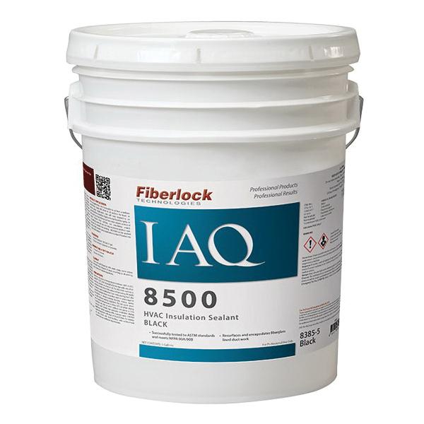 Fiberlock Technologies IAQ 8500 HVAC Insulation Sealer, 5 gal Net Content, Liquid Form, Black, Semi-Gloss, Composition: Zinc Oxide, Azadioxabicyclooctane, Isomer 1, Potassium Pyrophosphate, Monoisobutanolamine, 2-(Methylamino)-2-Methyl-1-Propanol, Calcium Carbonate, Silica Crystalline Quartz, Kaolin, Propylene Glycol, Silica Amorphous, Chlorothalonil, Non-Hazardous Ingredient, Carbon Black, 50 deg F, 1 to 2 hr Dry Time, 4 to 8 hr Recoating Time, 105 to 110 ku Viscosity, 89 g/L VOC, 8.5 pH, Applicable Materials: Reinforce Duct Liner or Duct Board Insulation Material, Application Method: Airless Spray, Brush, Roller, 200 to 600 sq-ft/gal Smooth Surface, 75 to 175 sq-ft/gal Porous Surface Coverage Area, 36 months Shelf Life