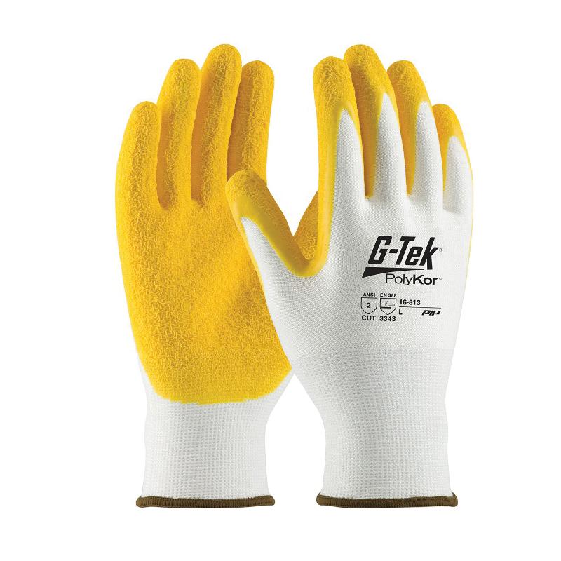 G-Tek® Cut-Resistant Gloves, Series: 16-813 Series, L, Latex Palm, White/Yellow, Coated Seamless Knit Style, PolyKor® Lining, Knit Wrist Cuff, Coating: Latex, Crinkle Grip, Latex Coating, ANSI Cut-Resistance Level: A2, Resists: Abrasion, Cut, Puncture, Tear