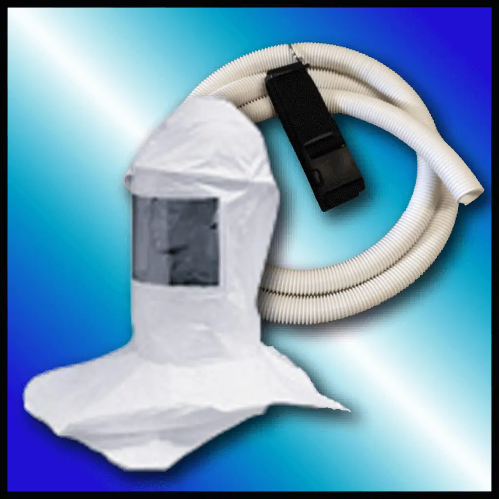 White Tyvek Hood, complete with Headband, Breathing Tube, Belt and Clip, for use with the CB8000 Air Conditioned Fresh Air Supply system. Hood and headband allow for complete head protection. The breathing tube, delivers maximum air flow from the CB8000 system air line hose, directly to the hood. Belt and clip secure the breathing tube attachment, which allows for maximum high CFM air flow, to be delivered to the industry user.