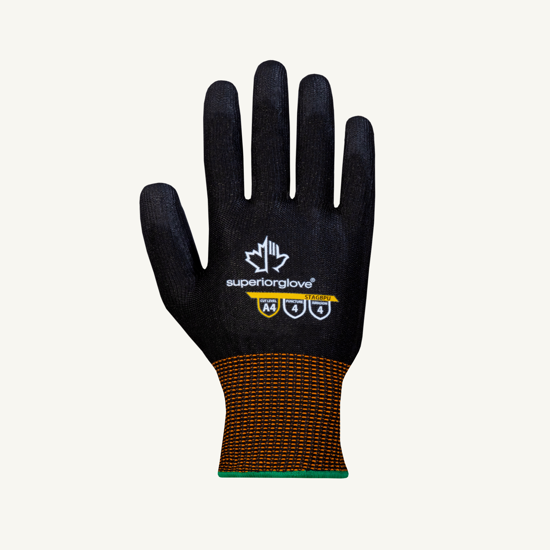 Our TenActiv™ STAGBPU gloves are made from dark colored TenActiv™ engineered yarn to hide dirt and stains while protecting worker hands from cut hazards. The low-linting dark coloring allows these gloves to be used longer between laundering cycles, increasing their wear-life. They are ideal for work in unfinished or grimy environments where dirt is visible. Featuring moderate 360° cut protection with ANSI A4 cut resistance and polyurethane dipped palms for dry grip, they balance protection and comfort with a bare hand feel and dexterity.