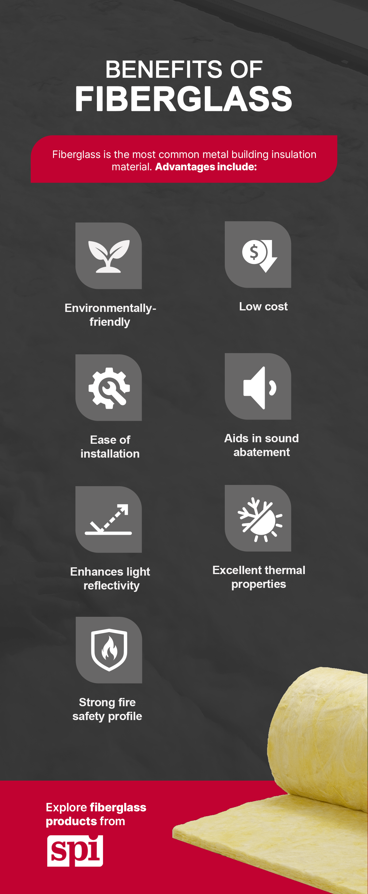 Fiberglass insulation is the most common metal building insulation material type due to its low cost, ease of installation, and strong fire safety profile. Other advantages of fiberglass metal building insulation include: