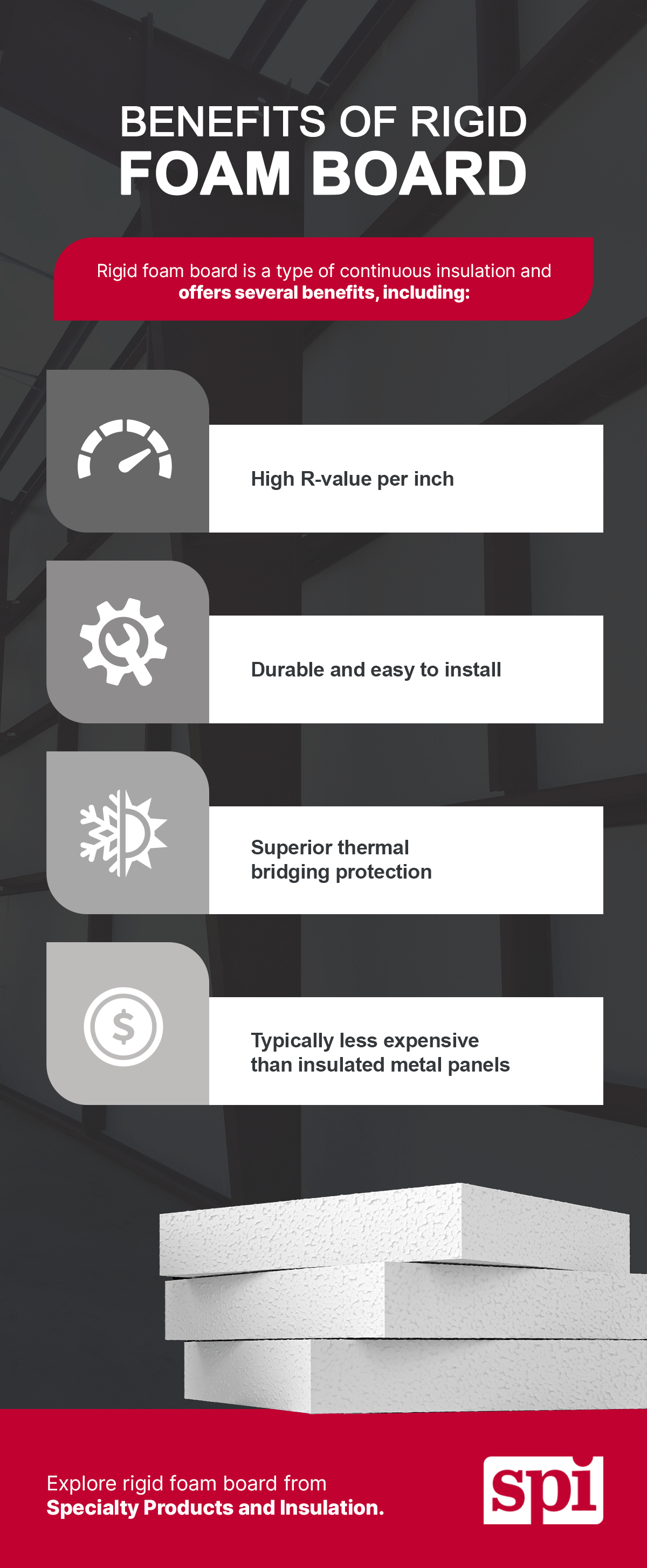 Rigid foam board is a type of continuous insulation and typically consists of a rigid polyisocyanurate or polyurethane foam core. Most rigid insulation systems can be used in both the roof and walls of metal buildings. Rigid board products are purchased in sheets and are installed on the exterior framing members of a metal building. Rigid foam board offers several benefits, including: